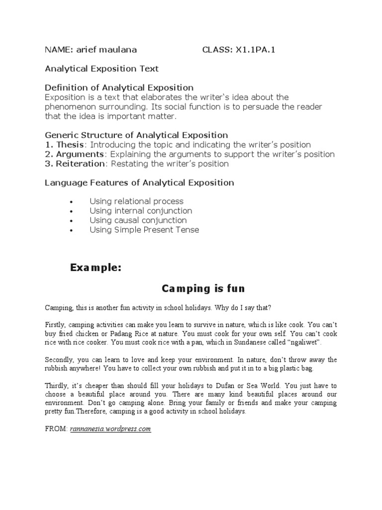 Doc Analytical Exposition Text Yue Sri Academia Edu from 0.academia-photos.com In this example of analytical exposition text, paragraph 2 and 3 are the detail arguments presented in a reporting fact. Example of analytical exposition 1. An analytical exposition is a type of spoken or written text that is intended to persuade the listeners or readers that something is the case. A analytical exposition is a form of writing that uses generic human or non human participants to describe a mental process. Stating thesis, arguments, and reiteration. Social media are bad for teenagers. It is broken down into 3 general sections of explanation. Analytical exposition is a kind of text that belongs to the type of argumentation text where the text contains detailed author's thinking about a for example, an elderly woman who couldn't even remember her husband's name would remember the details of her favorite song;